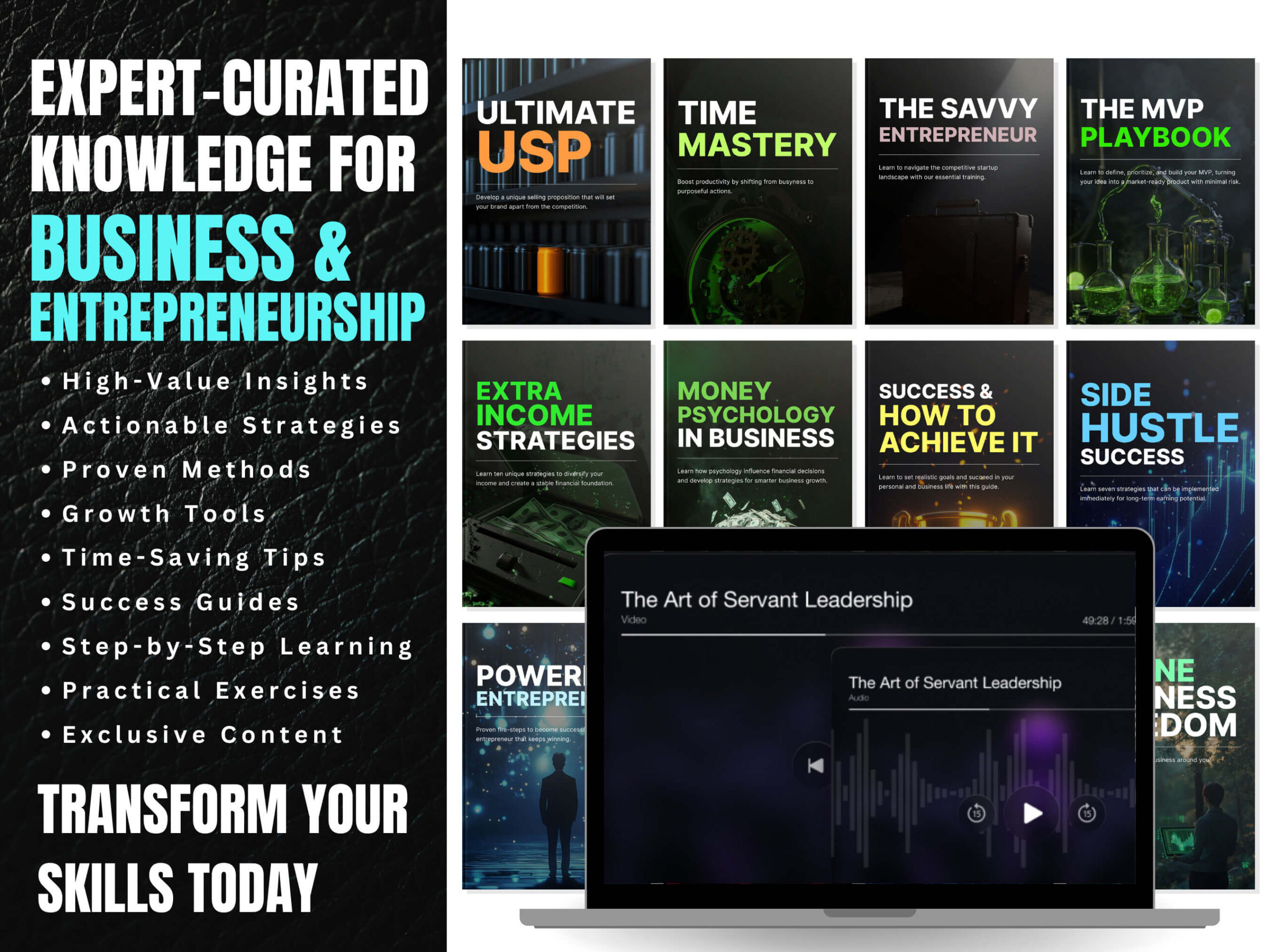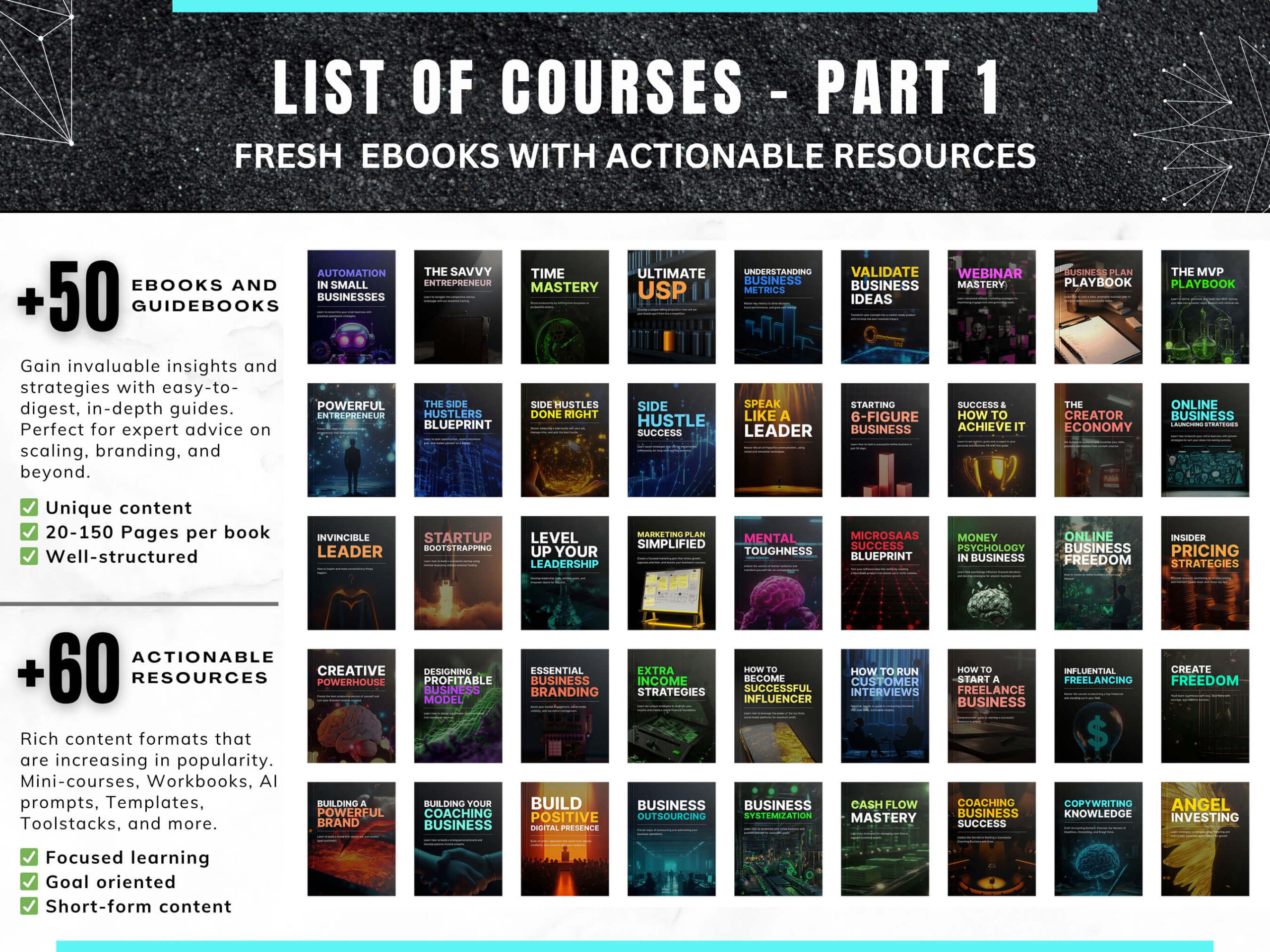 A complete, professional-grade collection of video courses, business toolkits, workbooks, templates, guides, and strategy ebooks designed to help you launch, grow, automate, and scale a successful online business