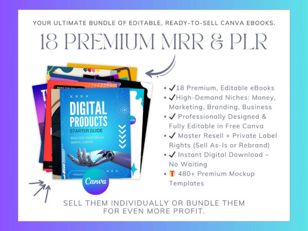 Imagine opening a shop with 18 ready-to-sell premium eBooks in the hottest niches… all editable in free Canva. No design skills? No problem. No time to write 1,000 pages? Already done.