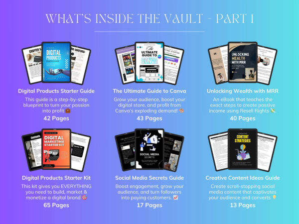 - Digital Products Starter Kit – 65 Pages: This kit gives you EVERYTHING you need to build, market & monetize a digital brand.