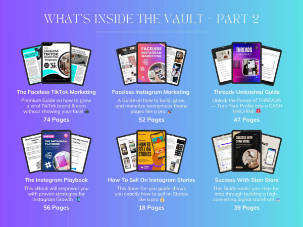 - Faceless Instagram Marketing – 52 Pages: A Guide on how to build, grow, and monetize anonymous theme pages like a pro.