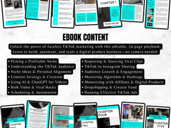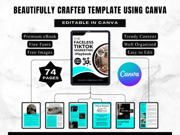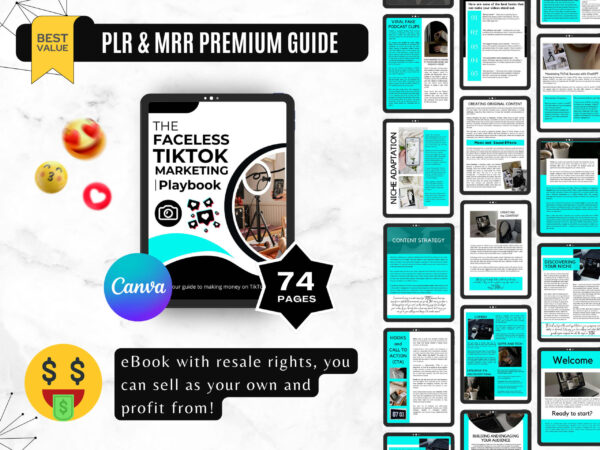 The Faceless TikTok Marketing Playbook is a fully editable, 74-page eBook template that teaches the exact strategies faceless creators use to build massive followings and monetize like pros — and you get the full MRR + PLR rights to resell or use as your own.